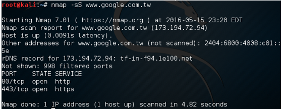 -sS:(SYN Stealth Scan)又稱為半開放式掃描,發出SYN請求後,若受測方有開啟的TCP端口就會回應封包,再接著發送RST封包終止連線,因為沒有完成正常的3向交握,故測試主機不會留下紀錄(防火牆可能會留下紀錄)。