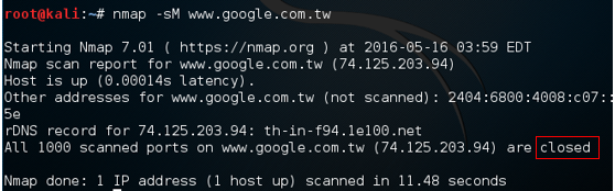 -sM:(Mainmon Scan)原理類似-sA,但封包除了ACK之外還多加了一個FIN,可以用來判別那些端口是開啟狀態。
