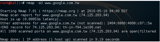 -sU:(UDP Scan)探測受測主機是否提供UDP(用戶資料流協定)服務。
