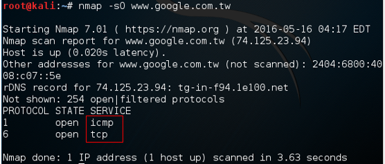 -sO:(IP Protocol Scan)偵測目標主機的系統支援那些IP協定,ex:TCP、ICMP、IGP,為主機識別技術的一種。